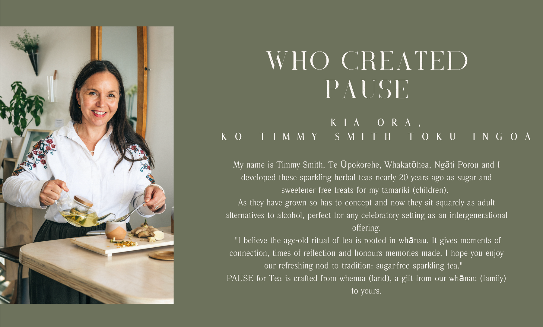 Our sparkling green tea is an innovative twist on a timeless classic.” PAUSE… for a chilled sparkling sugar-free brewed tea. Created to ignite your senses & soothe your soul. A heartfelt tuku from our whānau to yours.
