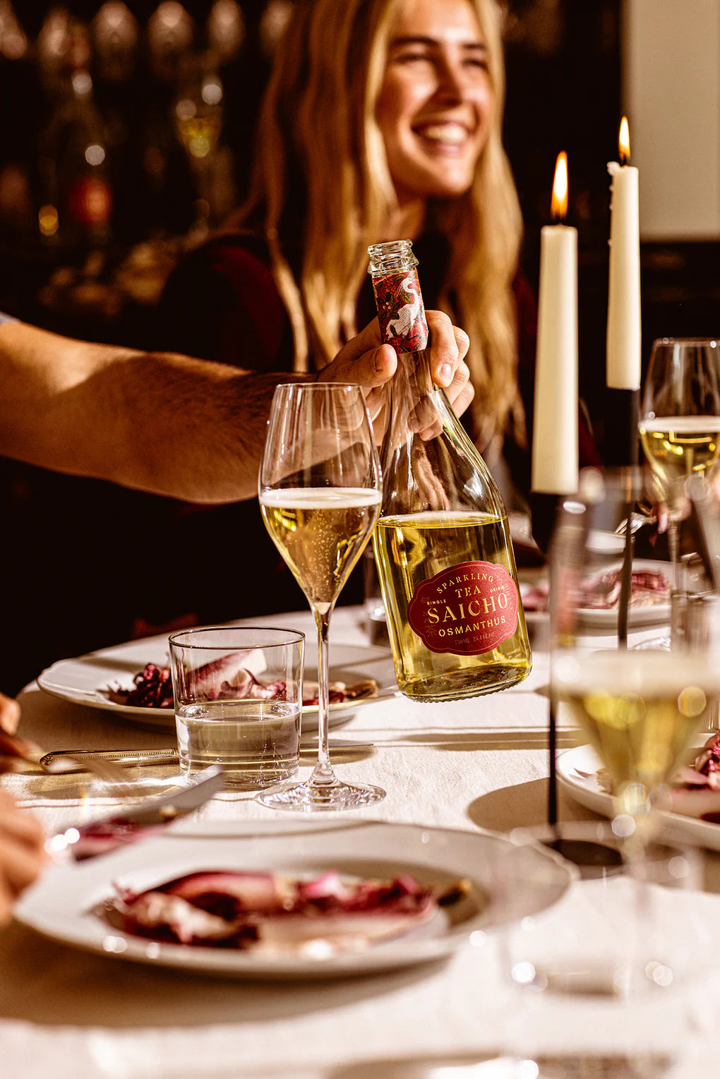 Osmanthus Oolong begins its journey in the mist-covered mountains of Xianyou County, Fujian Province, China, where mineral-rich red soil and high elevations, around 800 metres above sea level, create ideal conditions for exceptional tea. Harvested in autumn, the Tie Guan Yin oolong is carefully harvested, and fresh osmanthus blossoms, gathered at dawn when their fragrance is at its peak, are layered over the tea in traditional bamboo baskets. Over 48 hours, the blossoms are replaced multiple times, allowing the tea to naturally absorb their golden aroma, creating a depth and complexity. Once perfectly scented, the tea is cold-brewed for 24 hours using English spring water to preserve its delicate aromatics and floral character. A gentle sparkle is added to create Saicho’s signature effervescent finish — a modern expression of an ancient Chinese tradition and a celebration of tea at its finest.